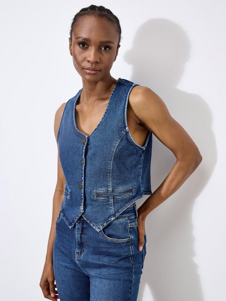 Designed for warm days, this cool and casual waistcoat is crafted from soft, stretch denim. In a flattering fit, it features snap-button fastenings and decorative welt pockets.Layer over a white tee and team with flared jeans to complete the look.