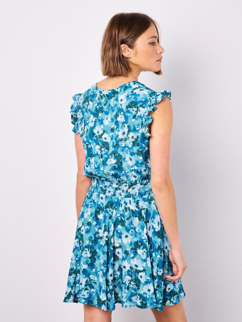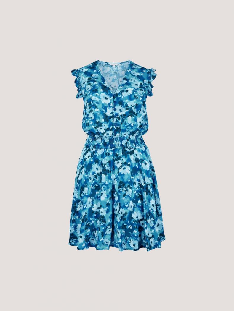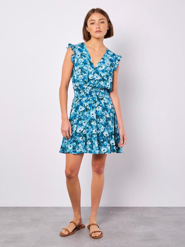 Crafted from floaty chiffon and featuring a floral print, this mini dress is a must-have for warmer days. It boasts a V-neck with a button-down bodice, ruffle armholes, and a shirred waist to create a flattering fit.Throw on and go with simple sandals for an effortlessly chic finish.