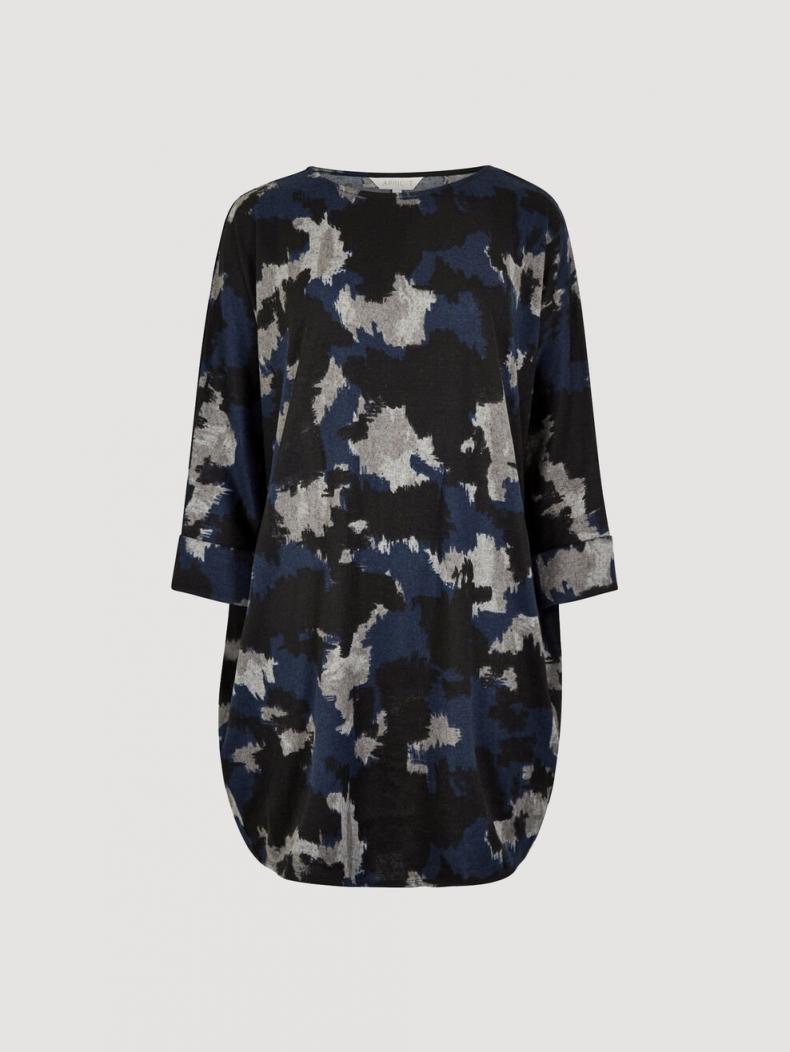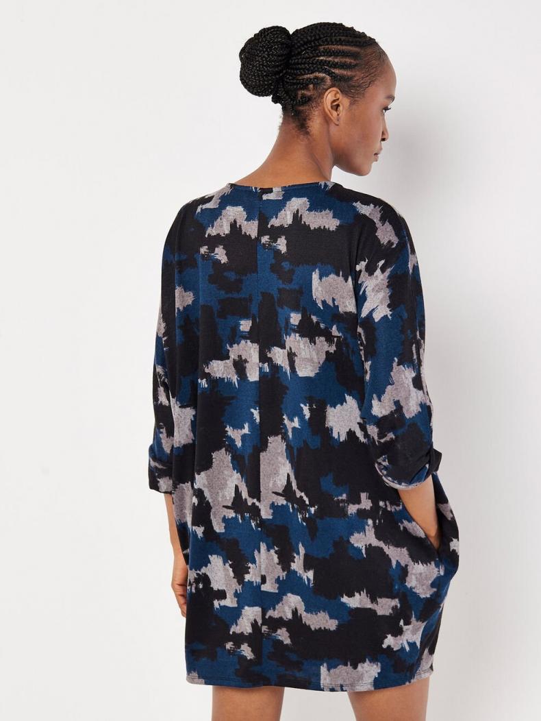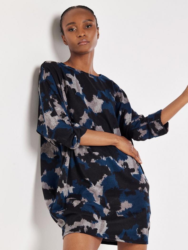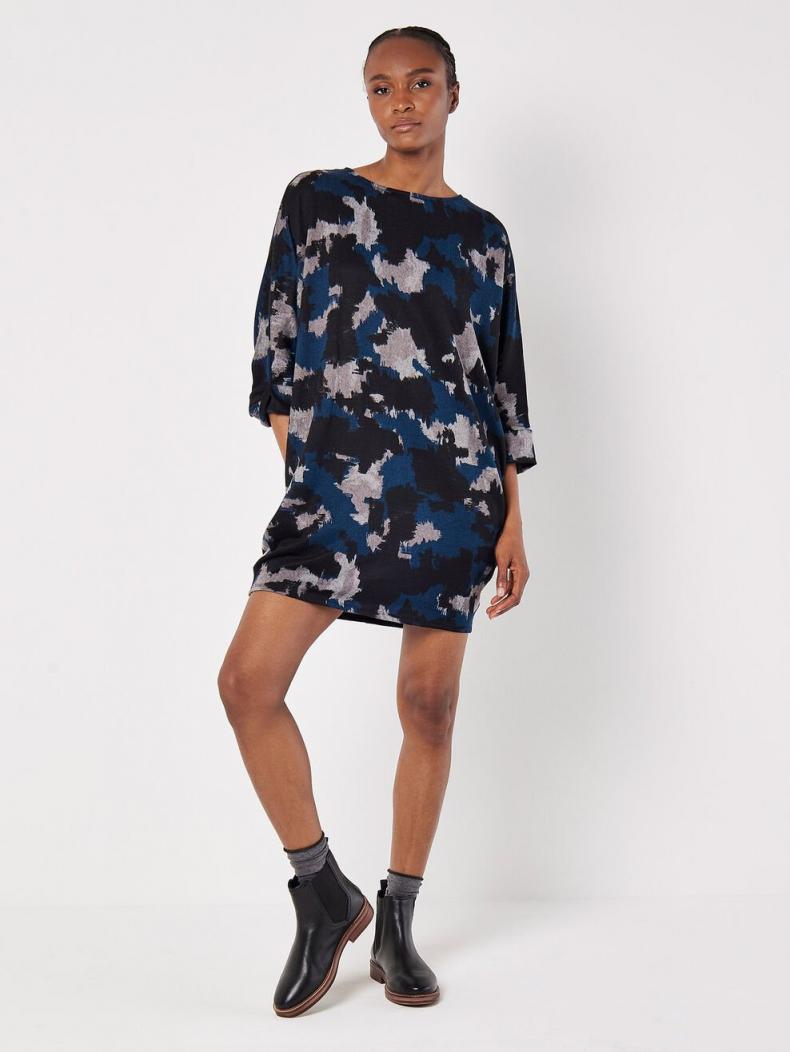 Combine comfort and style with this super-soft knit mini dress. In a figure-skimming fit designed for relaxed, off-duty days, it boasts a boat neckline, batwing sleeves with rolled cuffs, and practical side seam pockets. It’s finished with a pop of paint splash print. Complete the look with leggings and leather Chelsea boots.