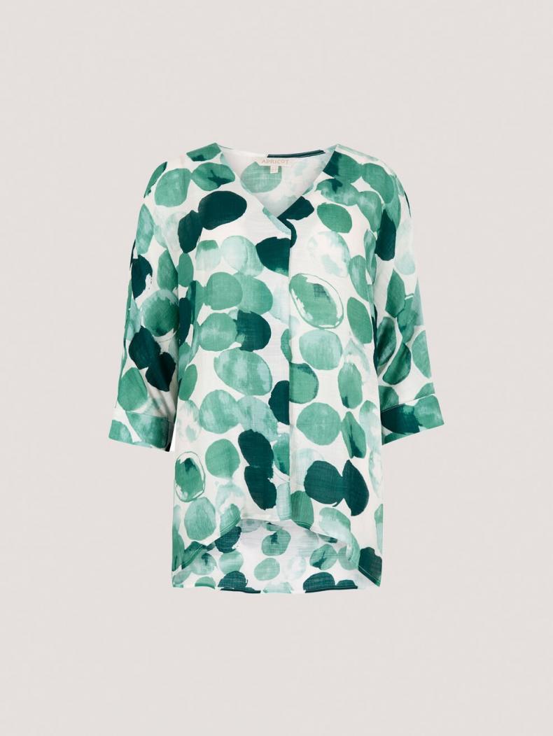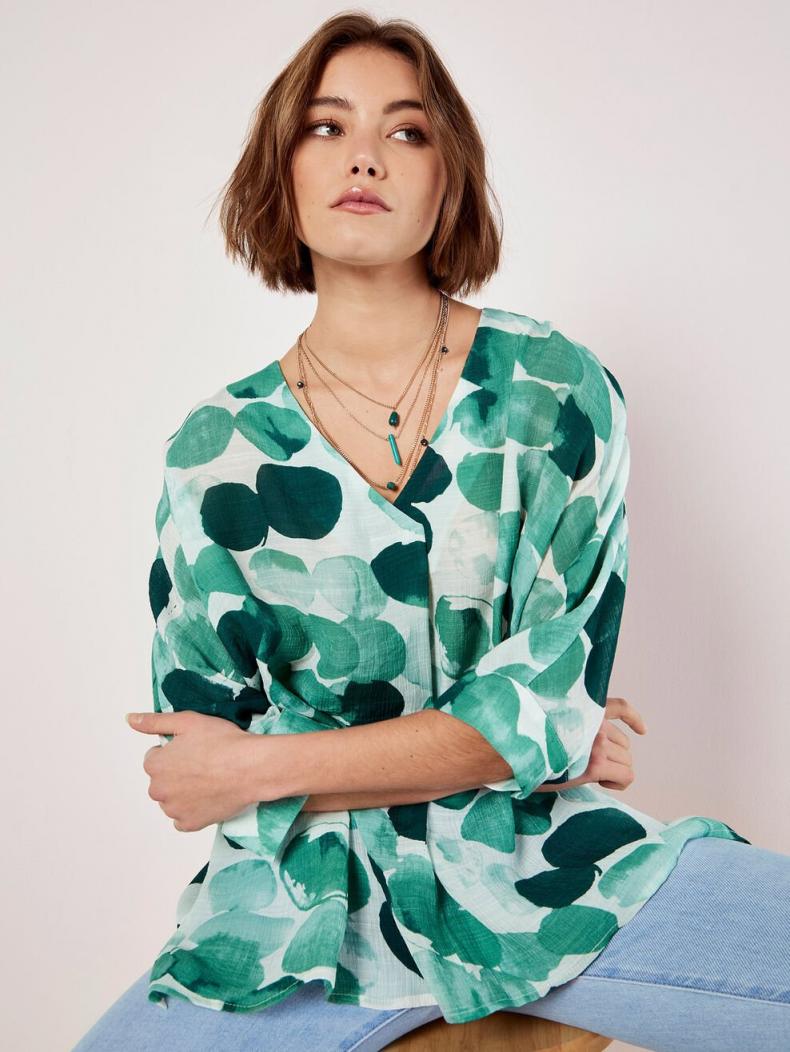 In a statement oversized fit, this lightweight, woven top is perfect for boho summer style. Framed by a V-neckline and rolled sleeves, it boasts pleat detailing through the front, an asymmetric hem, and an abstract paint print.Tuck yours into denim shorts and team with sandals for a sunshine-ready finish.