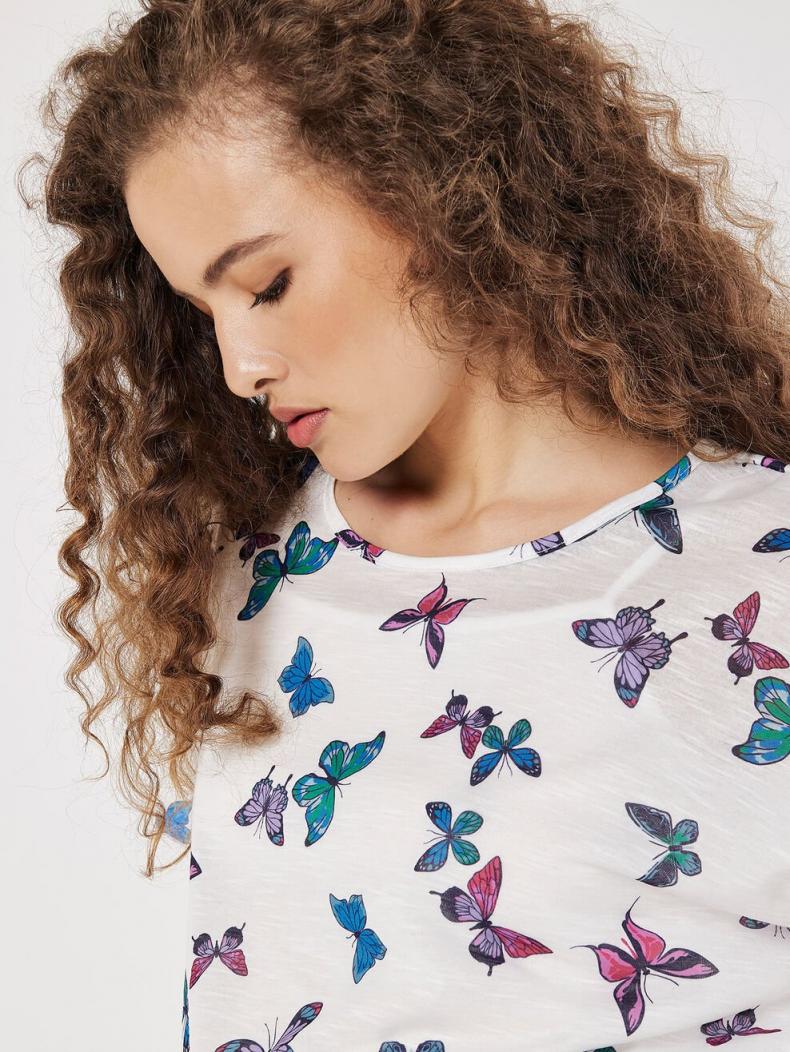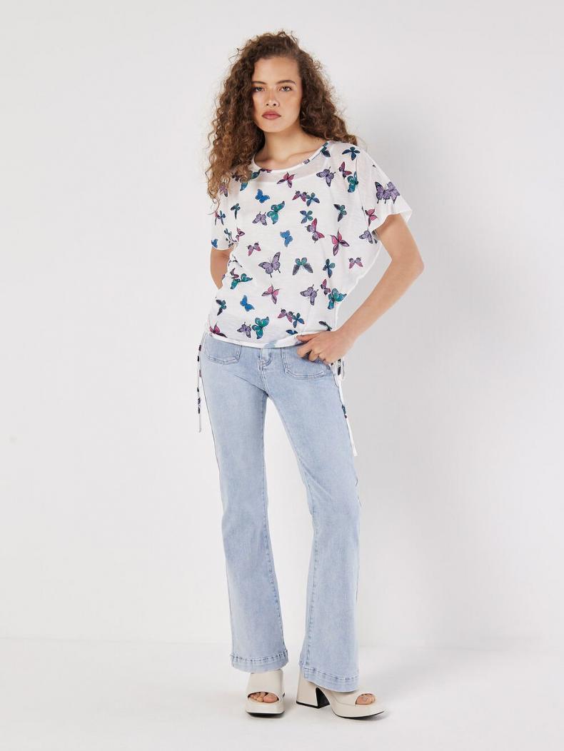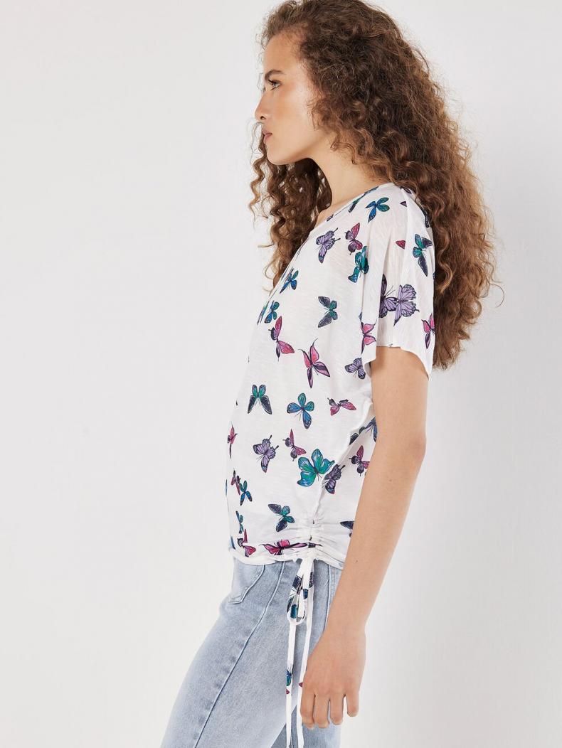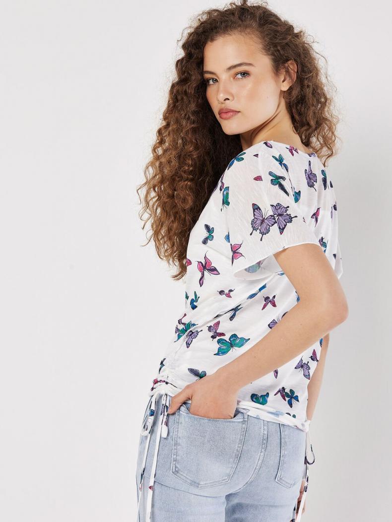 Build your weekend wardrobe with this butterfly print top. Crafted from a semi-sheer, stretch fabric with a camisole insert for modesty, it features batwing sleeves and ruched sides with drawstrings to create a flattering fit. Team with light-wash denim on off-duty days.